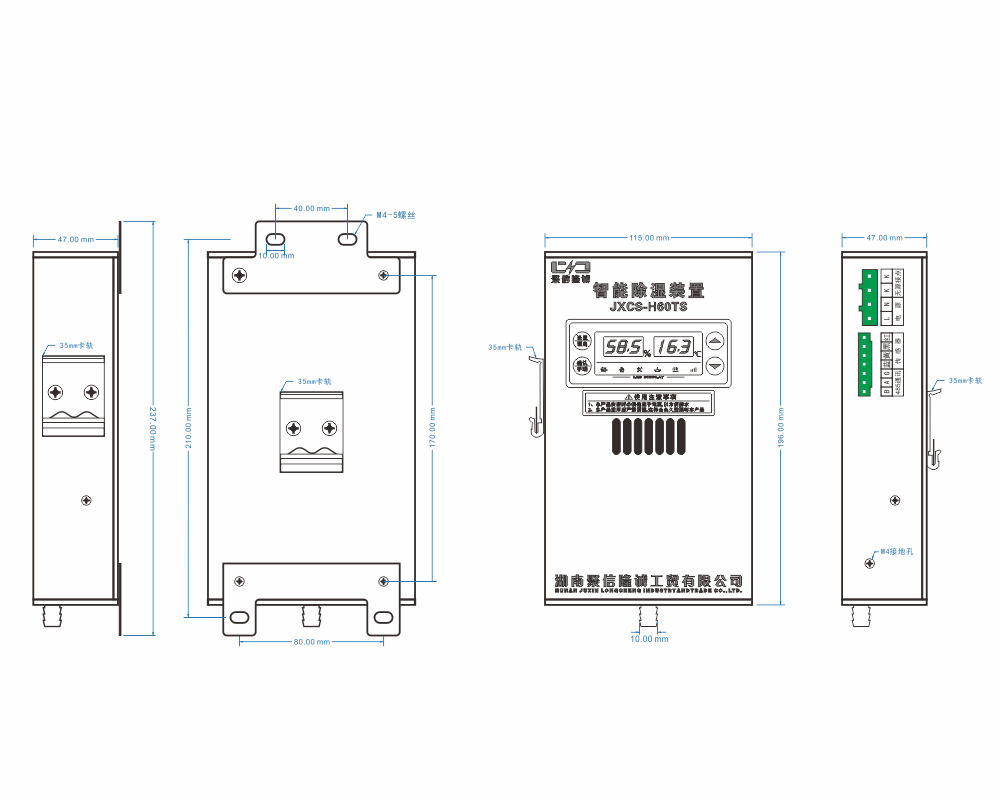 1、使用M5螺钉或者5mm的铆钉固定。安装时除湿装置必须竖放,出水口朝下。